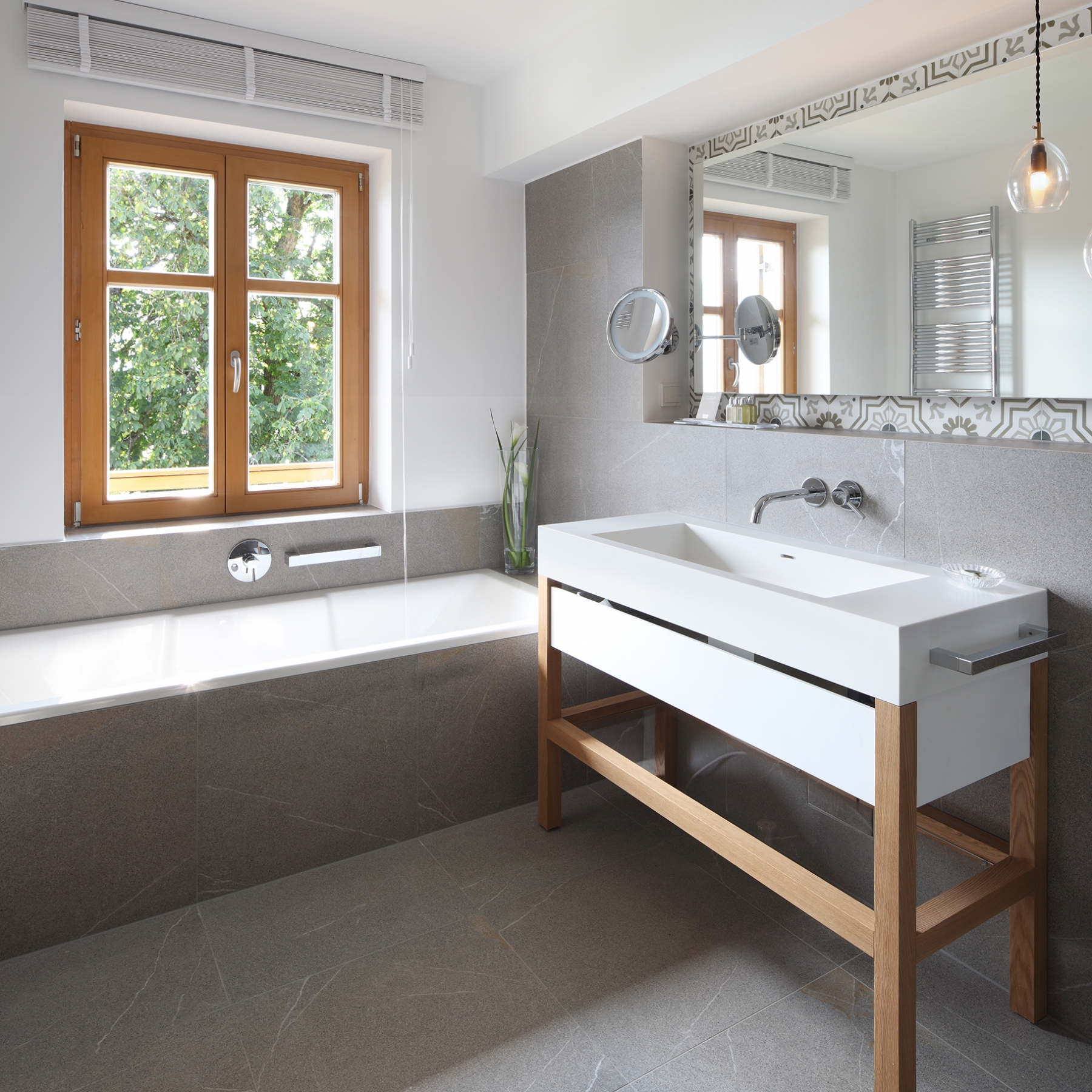 Vom privaten Südbalkon beobachten Sie das sanfte Treiben des Tegernsees. Freuen Sie sich auf harmonische Stunden in der Sitzecke, welche sich perfekt in den sonnigen Zimmererker schmiegt. Klare Linien, frische Farben und natürliche Materialien tragen in Kombination mit dem modernen Design die Jahreszeiten und Lebendigkeit des Tals nach Innen.