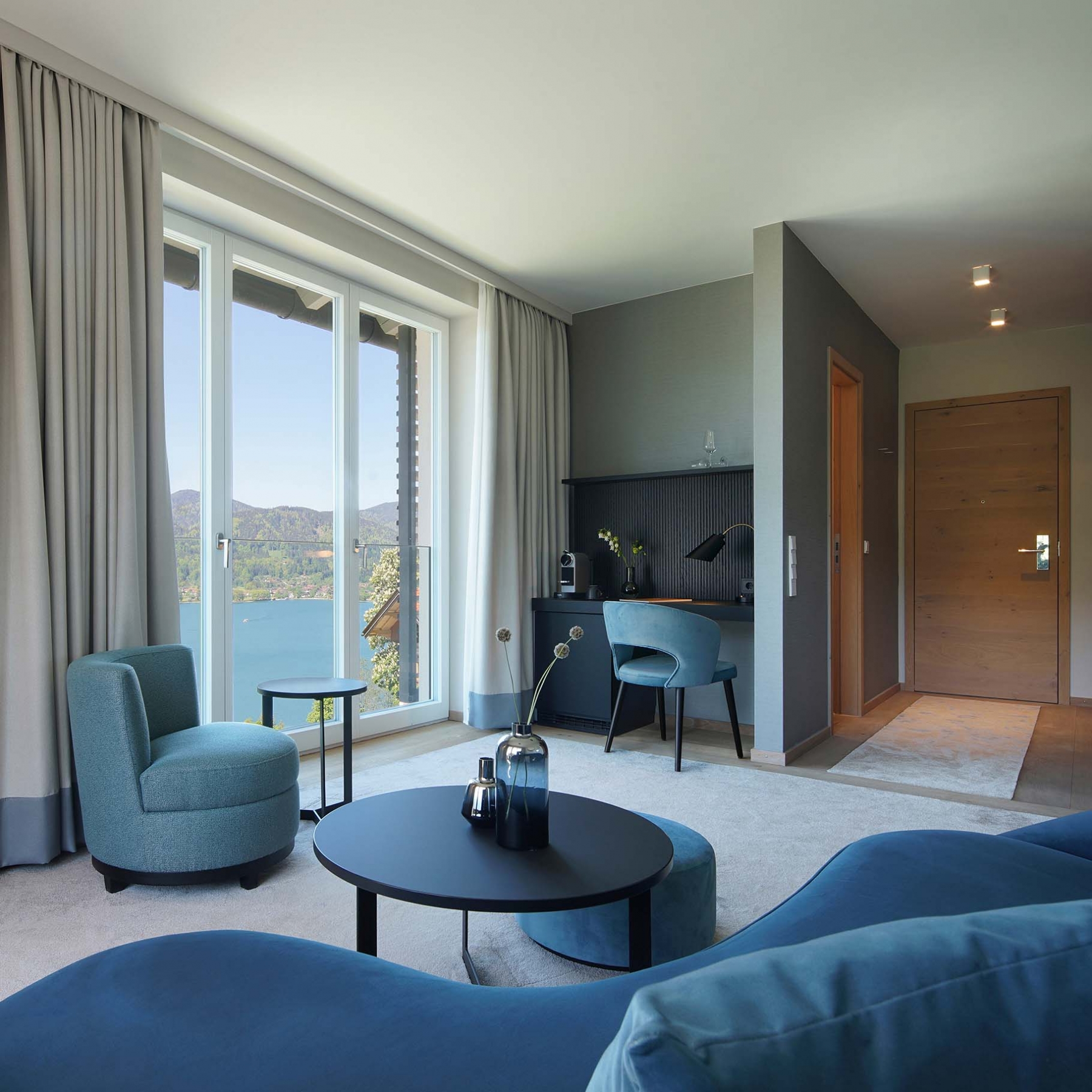 Die Superior Suiten im Haus Wallberg bestechen durch modernes Design in harmonischem Farbspiel aus Blau und Beige, samtige Texturen und eine einmalig gemütliche Atmosphäre. Während der Schlafbereich mit eleganter Blumen-Strukturtapete an die Flora im Tal erinnert, orientiert sich das Design des Wohnraums am See, welcher uneingeschränkt durch die Fensterfront bestaunt werden kann. Ein großzügiger Panoramabalkon verspricht unvergleichlich schöne Momente.